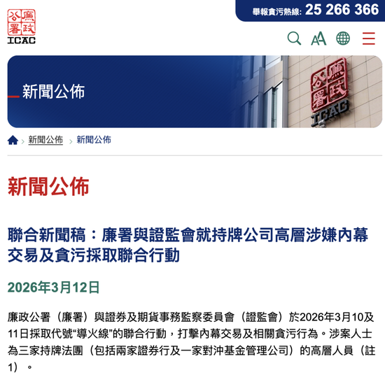 今晚,香港廉政公署(廉署)与香港证券及期货事务监察委员会(香港证监会)发布联合新闻稿,证实了这次联合行动。新闻稿件称,双方于2026年3月10及11日采取了代号“导火线(Fuse)”的联合行动,以打击内幕交易及相关贪污行为。涉案人士为三家持牌法团(包括两家证券行及一家对冲基金管理公司)的高层人员(注1)。