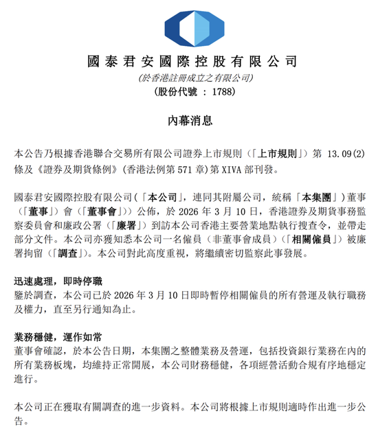 此外,国泰君安国际早上发公告,表示3月10日证监会及廉署到访公司香港主要营业地点执行搜查令,并带走部分文件,亦获知悉一名雇员(非董事会成员)被廉署拘留调查。公司对此高度重视,将继续密切监察此事发展。